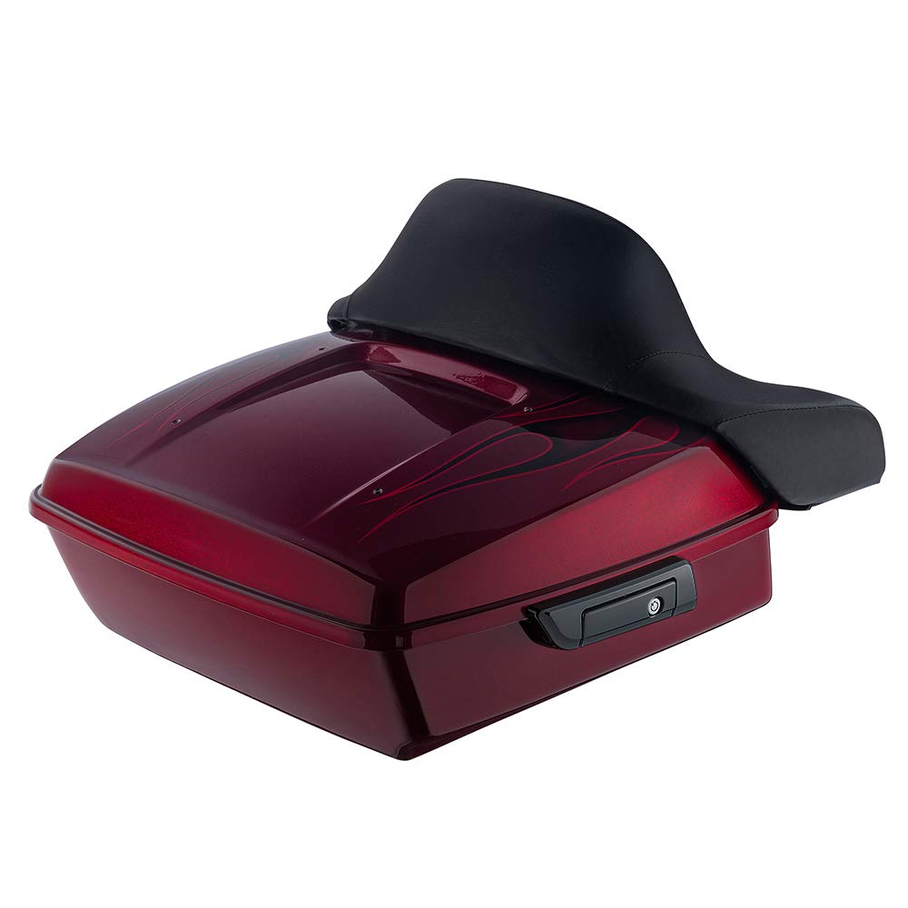 Moto Onfire Hard Candy Hot Rod Red Flake, Tour Trunk Pack for Harley Touring, Street Glide, 2014-2020 (Top Lid with Flame Mark, Chopped Tour Trunk Pack with Wrap-Around Backrest(Black Latch))